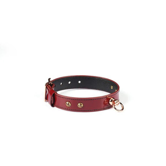 Bordeaux glanzende leder collar met gouden glas kristallen
