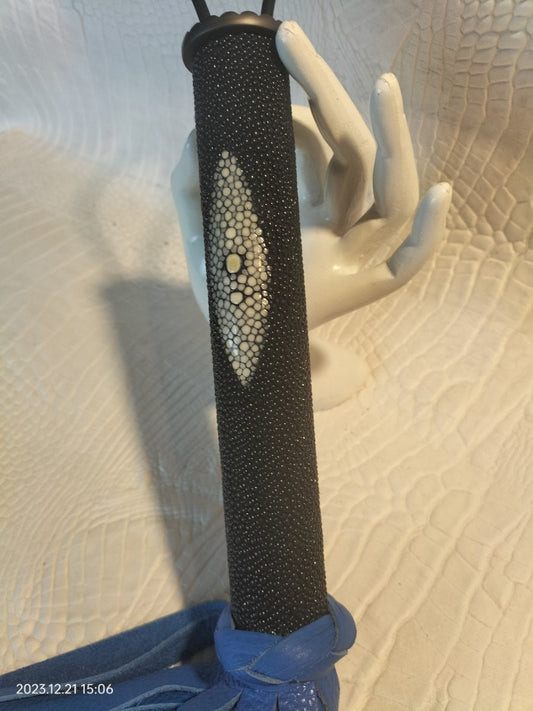 Blauw lederen flogger met zwart ongeschuurd roggenleer handvat