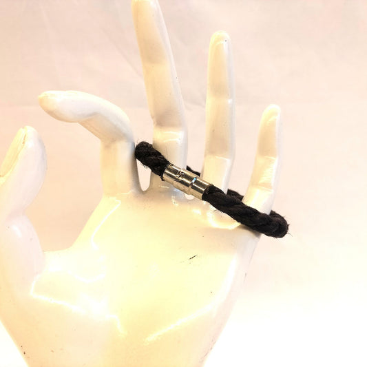 Bracelet homme en cuir noir avec coutures et menottes en argent