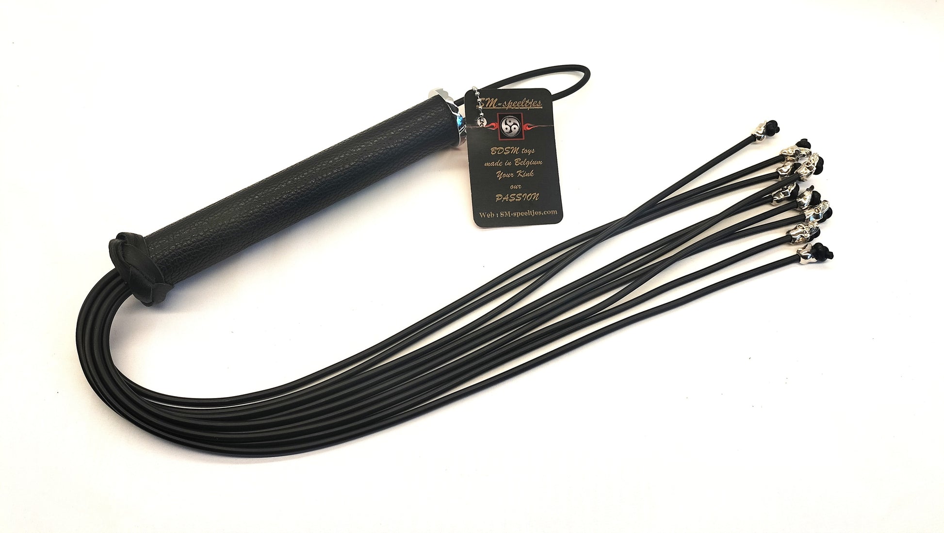Ontdek deze unieke handgemaakte Cat O Nine gesel met RVS skulls, een venijnige BDSM toy voor intense impact play sessies. Deze exclusieve zweep is volledig handgemaakt in België en combineert 9 EPDM rubber falls (4 mm dik) met kleine RVS skulls aan de uiteinden voor extra impact. Met een totale lengte van 70 cm en 50 cm lange falls levert deze gesel een scherpe, stekende sensatie die perfect is voor gevorderde BDSM liefhebbers. Het zwart lederen handvat met chroom einddop zorgt voor een luxe uitstraling en stevige grip.